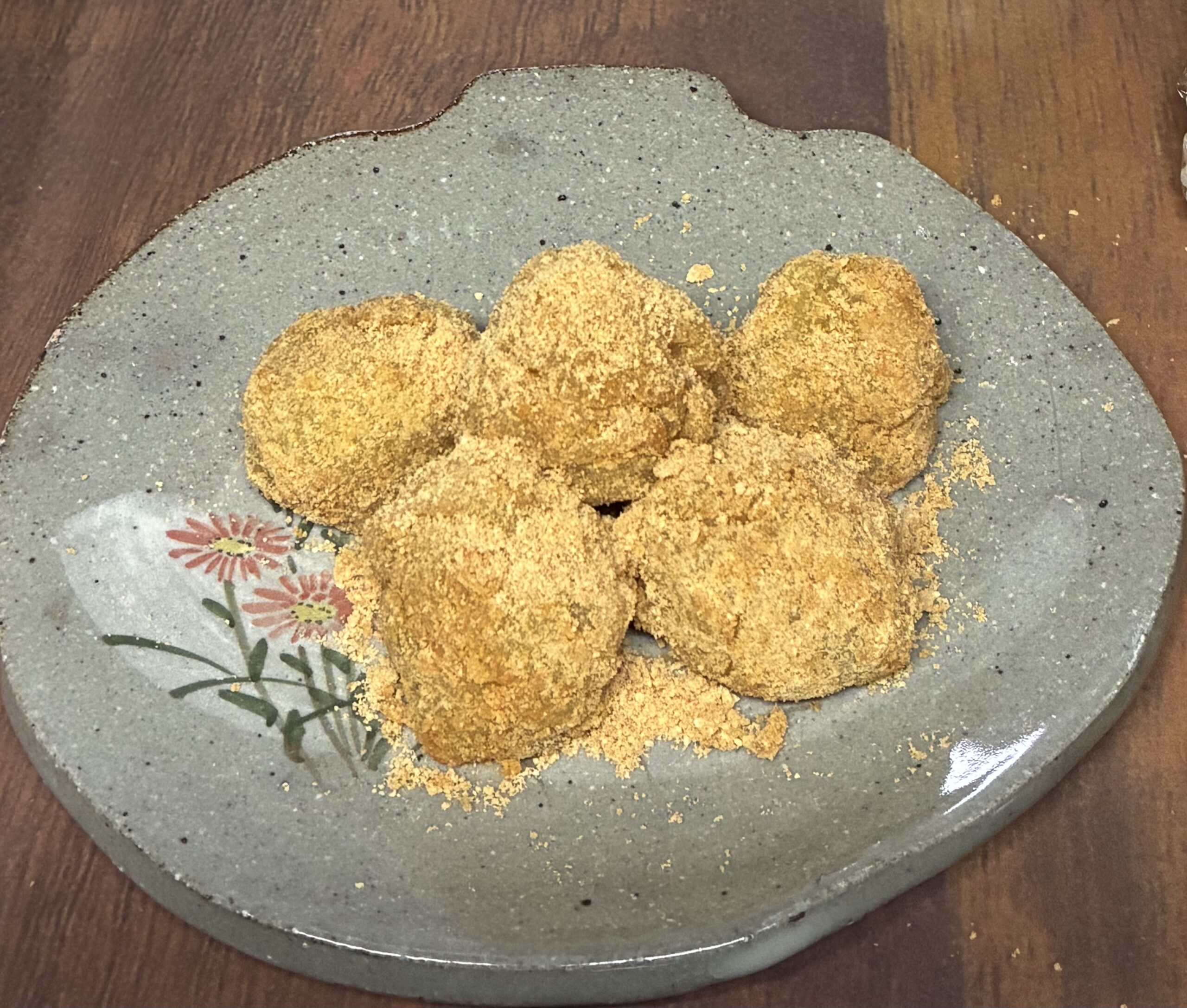 蒸すか茹でたさつまいもを潰して、火にかけた鍋に水溶き片栗粉も加え、もったりしたら丸めてきな粉をまぶす。